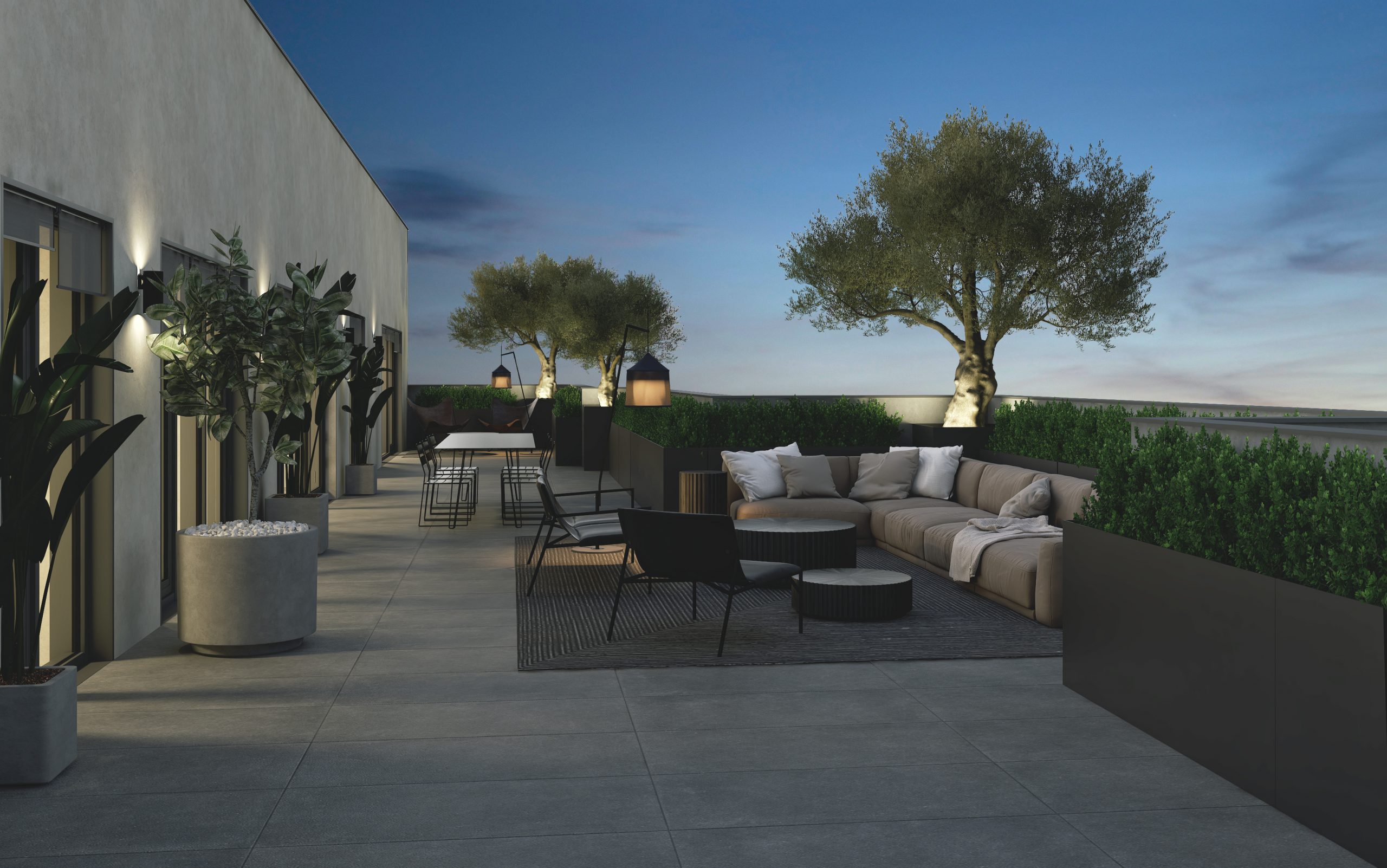 La promoción Rocafort142 ofrece distintas tipologías de vivienda: pisos en planta baja con amplias terrazas sobre la zona comunitaria, pisos exteriores y áticos.